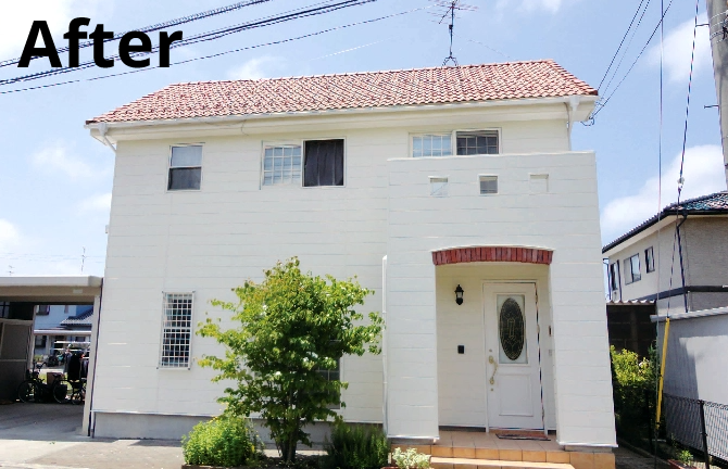 お家が海に近く角地ということもあり、外壁にはところどころ爆裂が発生し素地が見えてしまっている状態でした。今回は耐久性の高いガルバリウム鋼板にフッ素焼付塗装を施した「はる一番」を施工し、耐久性だけでなく美観も長期間維持できる外壁に生まれ変わりました。